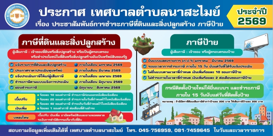 ประกาศเทศบาลตำบลนาสะไมย์ เรื่อง ประชาสัมพันธ์การชำระภาษีที่ดินและสิ่งปลูกสร้าง ภาษีป้าย ประจำปี 2569